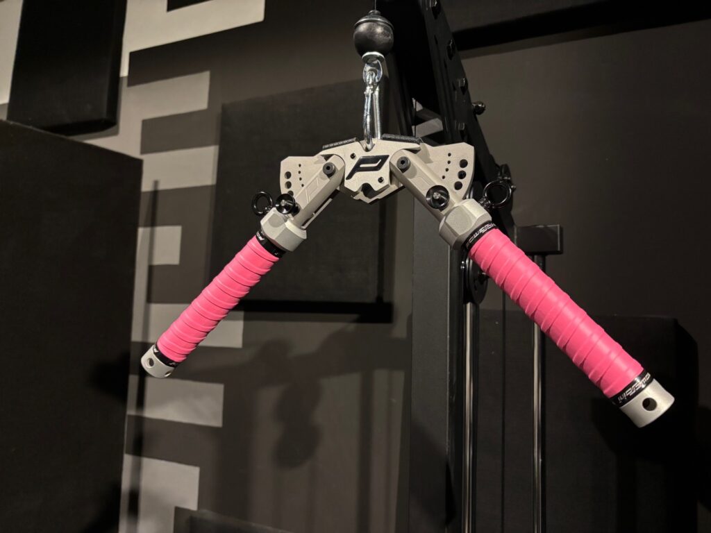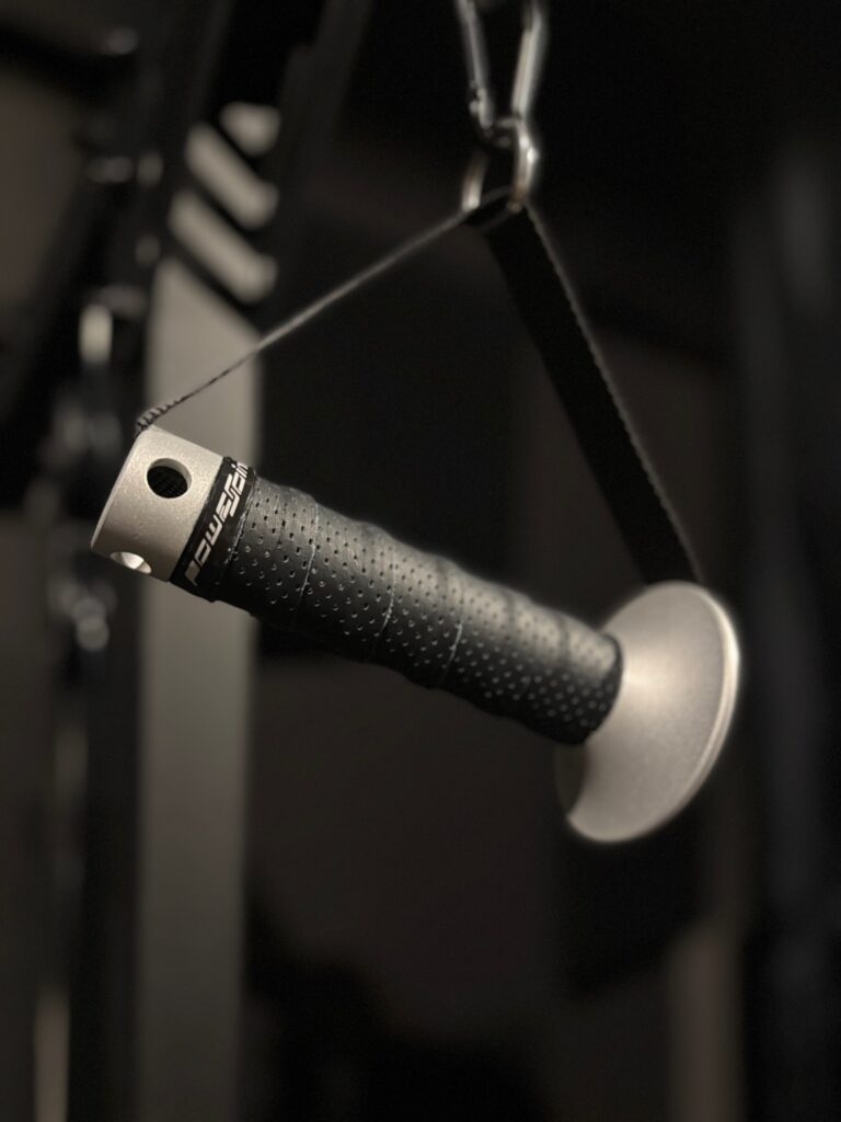Le maniglie presentano un’estremità sagomata a forma di cono, integrata direttamente nella struttura dell’impugnatura. Questa particolare conformazione è studiata per rispondere a specifiche esigenze biomeccaniche durante l’esecuzione di particolari esercizi.Il cono agisce come punto di appoggio anatomico per la mano, offrendo un supporto stabile in fase di trazione. Questo consente all’utente di scaricare parzialmente il carico, riducendo l’affaticamento della muscolatura e migliorando la distribuzione delle forze lungo l’intero arto superiore